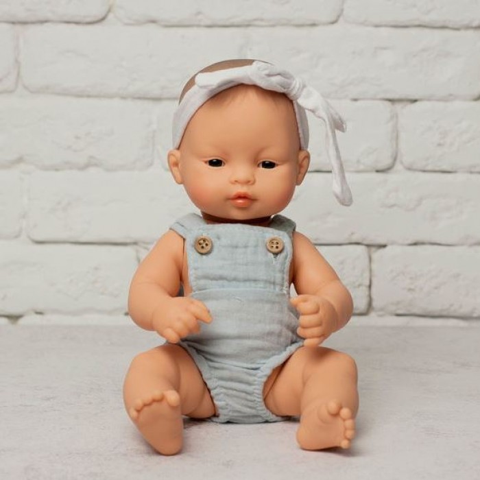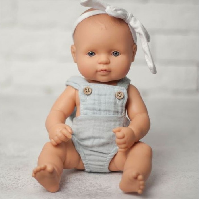 Нежный комплект для пупса Miniland 32 см состоит из песочника на бретельках и белой повязочки. В комплекте прилагается вешалка.