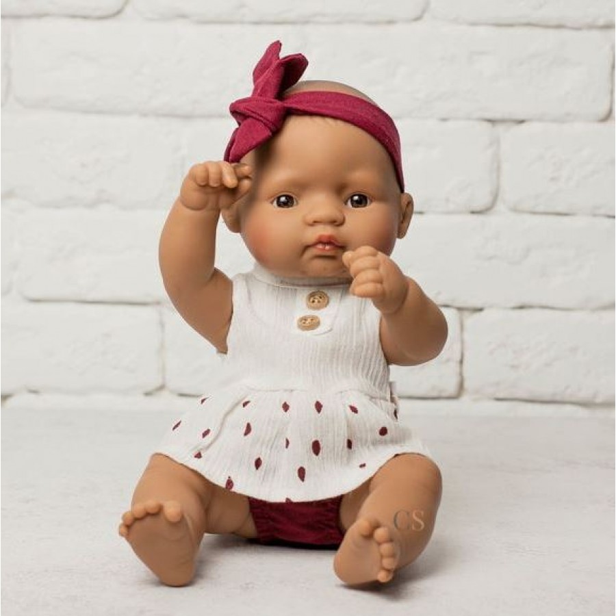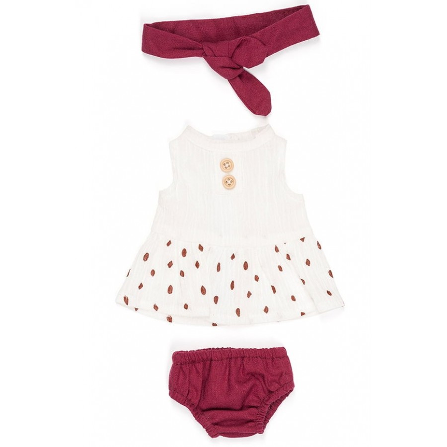 Стильный комплект для пупса Miniland 32 см состоит из сарафанчика без рукавов, трусиков и повязки для головы.