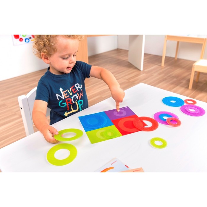 Набор подходит для занятий в развивающих центрах, детских садах, на индивидуальных уроках с педагогом, а также дома. При этом его можно использовать как на световом столе, так и без него — кольца остаются удобными для сортировки, счёта и логических игр.