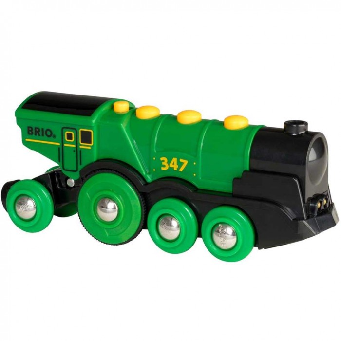 Благодаря светящимся двум передним фарам, полной скорости, мощным колесам и звуку «чу-чу» этот локомотив впечатляет даже самого опытного машиниста. Поезд может двигаться вперед/назад, а переключатель сверху позволяет переключиться в ручное управление поездом. Как и все локомотивы бренда, его можно примагнитить к другим вагонам. Отправляйтесь в путешествие с новым набором. Теперь можно изобретать ещё больше игровых сюжетов в Вашем городе BRIO.