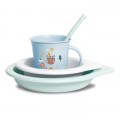 Продуманная форма элементов помогает ребёнку учиться есть самостоятельно, а лёгкие и безопасные материалы делают набор практичным для дома и поездок. Нежный блакитный цвет и иллюстрации коллекции «Лесные истории» создают спокойную и уютную атмосферу за столом.