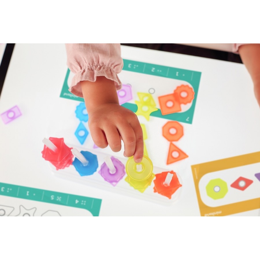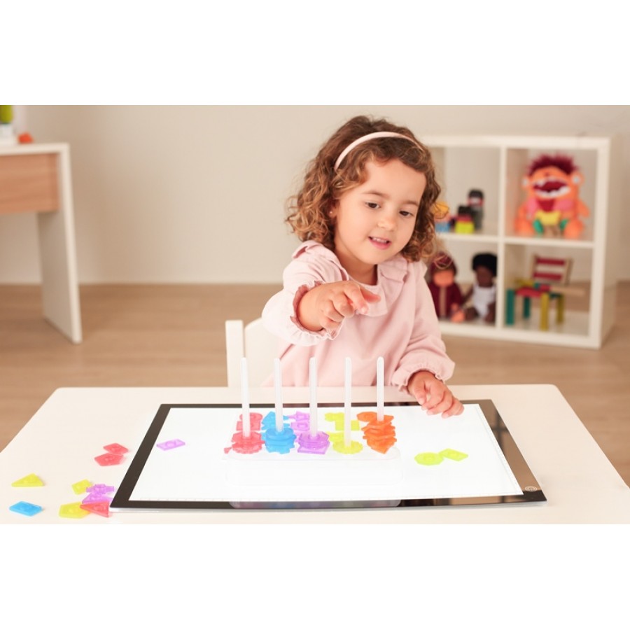 Он поставляется с прозрачными карточками с заданиями разного уровня сложности. Подходит для использования на световых столах и планшетах.