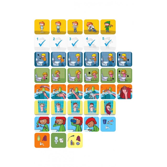 Набор помогает закреплять базовые навыки самообслуживания: понимание последовательности действий после туалета, обязательное мытьё рук и общий порядок выполнения ежедневных гигиенических процедур.