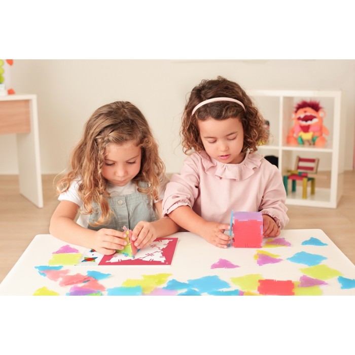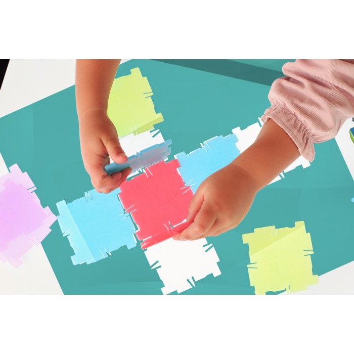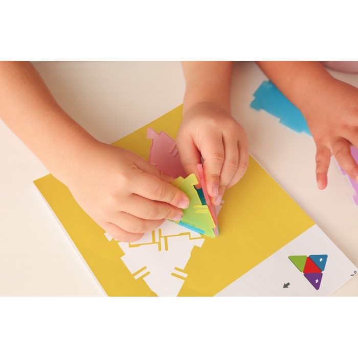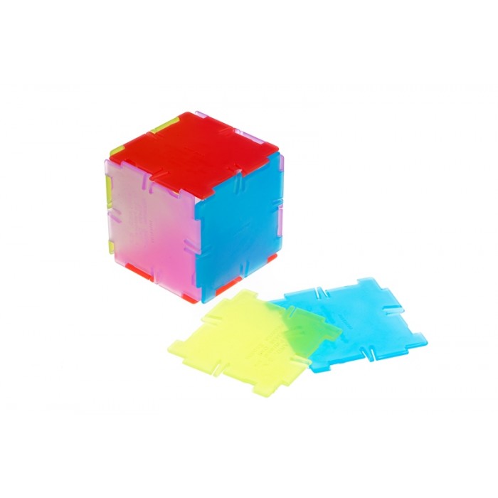 Набор состоит из 56 полупрозрачных двухмерных многоугольников, которые соединяются между собой и позволяют строить трёхмерные объёмные формы и многогранники. Работа с элементами помогает ребёнку перейти от плоских фигур к осознанию объёма, структуры и формы в пространстве.