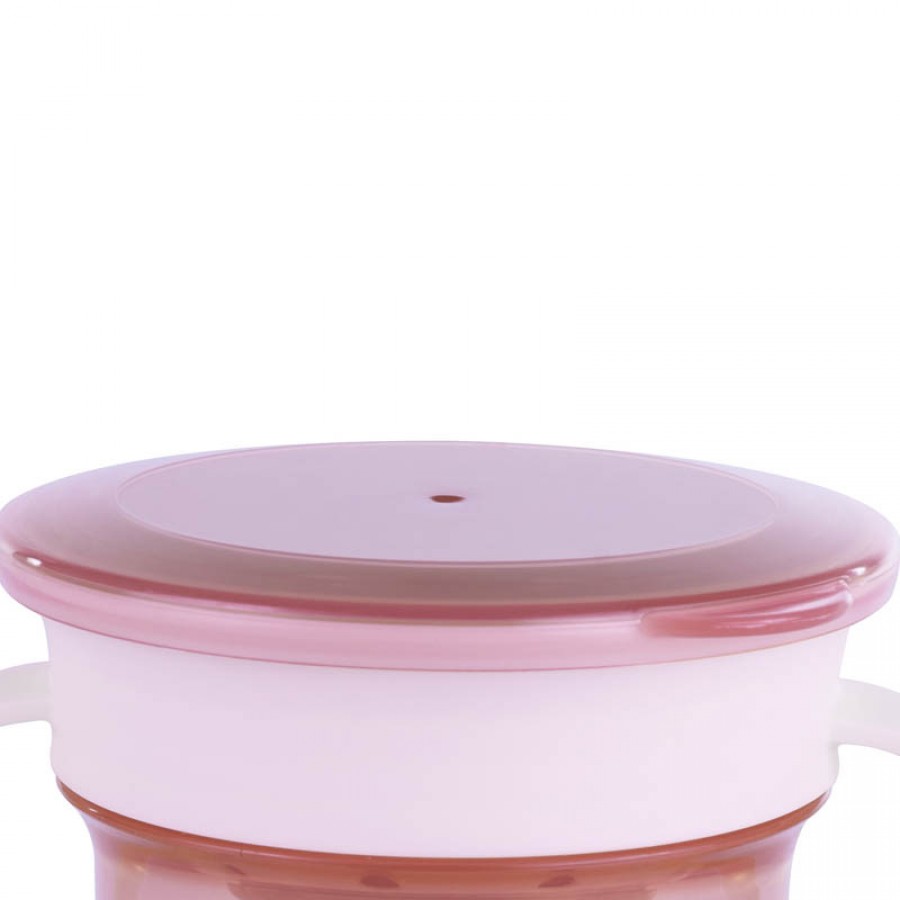 Система 360° в поильнике устроена так, что ребёнок может пить с любого края поильника — со всех сторон, под любым углом. Клапан внутри поильника автоматически открывается при сосании и закрывается, когда ребёнок прекращает пить, что предотвращает проливание жидкости.