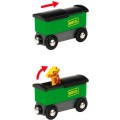 Красочный поезд с эффектом милой неожиданности. Желтый паровоз с забавным принтом сафари и два фургона с прикрепленными в него жирафом и зеброй. Сдвиньте крышу фургона и животные быстро поднимут головы, чтобы поздороваться. Снова задвиньте крышу, и они опустятся в вагон.