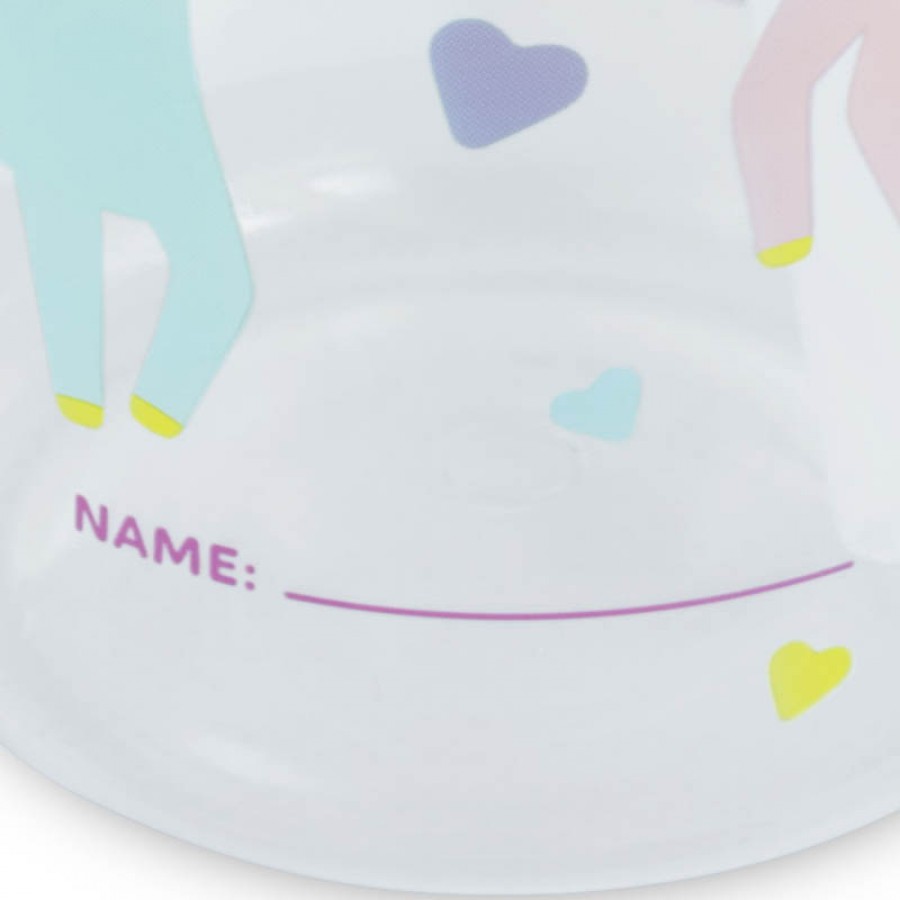 На корпусе есть мерная шкала в миллилитрах для удобного контроля объёма жидкости. Также предусмотрено место для написания имени ребёнка, что помогает избежать путаницы в учебных заведениях и других учреждениях.