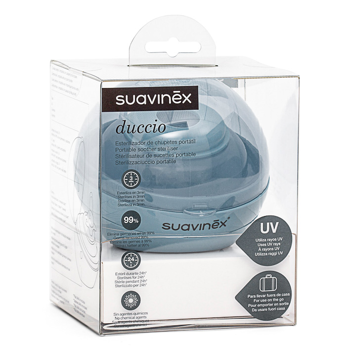 Портативный стерилизатор для пустышек Suavinex (синий) — компактное решение для быстрой стерилизации дома, на прогулке и в поездках. Устройство работает на ультрафиолетовом свете UV-C и помогает поддерживать гигиену пустышки без воды и химических средств.