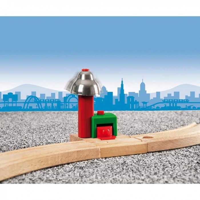 Никакого риска, что кто-то пересечет железнодорожный путь BRIO незамеченным. С помощью этого магнитного сигнала для железной дороги, когда проезжает поезд, звонит колокольчик. Батарейки не нужны, все работает за счет магнита.