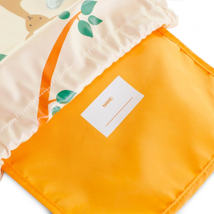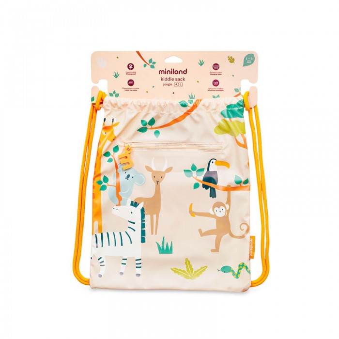 Miniland Kiddie Jungle - зручний та стильний рюкзак-мішок для малюків від 1 до 5 років. Виготовлений із водовідштовхувального поліуретану, який захищає вміст від вологи та забруднень. Розмір рюкзака досить місткий (29х35 см), щоб покласти туди змінний одяг, взуття, іграшки чи інші необхідні малюкові речі.