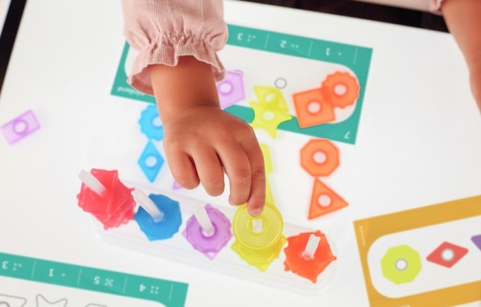 Дитина викладає елементи поверх підсвіченого контуру фігури.