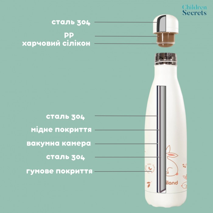 Термопляшечка Miniland Natur Bottle з приємною прогумованою поверхнею і ніжним дизайном стане відмінним супутником на вулиці, в поїздці або подорожі. Пляшка виконана з високоякісної нержавіючої сталі, має подвійні стінки і вакуумну камеру. Завдяки цьому вона підтримує температуру як холодних, так і гарячих напоїв більше 24 годин: через 12 годин з моменту наливання рідини (температура близько 95°C) її температура залишиться в межах 69°C. Термобутилка має щільну кришечку, що запобігає витіканню рідини, а також силіконову основу, яка допомагає утримувати термос на поверхні і запобігає його падінню.
