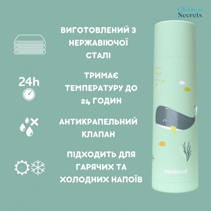 Питний термос із колекції Ocean стане чудовим супутником на вулиці, у поїздці чи подорожі. Термос виконаний з високоякісної нержавіючої сталі, матеріалу, що найбільш підходить для зберігання харчових продуктів. Має подвійні стінки та вакуумну камеру. Завдяки цьому він підтримує температуру як холодних, так і гарячих напоїв понад 24 години. Кришку термоса можна використовувати як чашку, а антикапельний клапан забезпечує велику безпеку та гігієну при транспортуванні рідин завдяки системі «клацання».