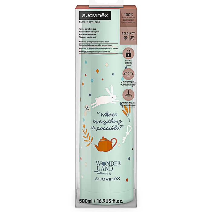 Термос для рідини Suavinex WONDERLAND, 500 мл (світло-зелений) — надійний термос із нержавіючої сталі для збереження температури напоїв протягом дня.