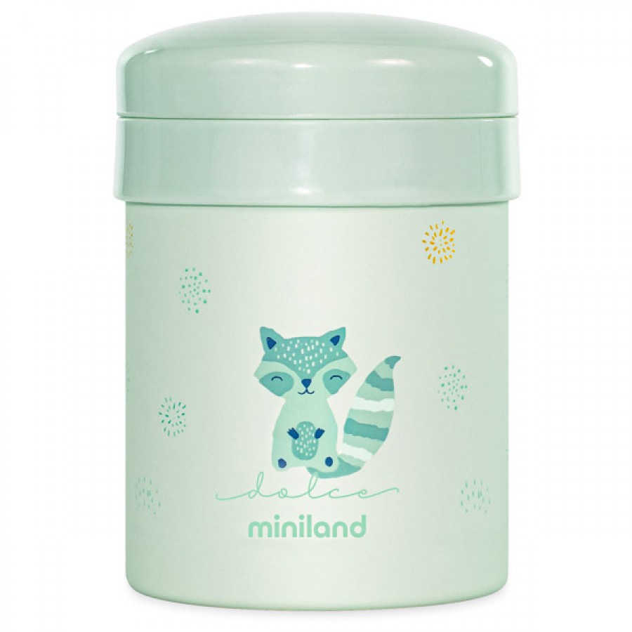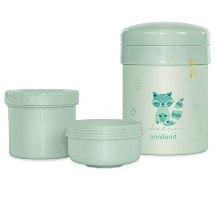 Харчовий термос із двома контейнерами Miniland Thermetic Mint має об'єм 700 мл та складається з двох внутрішніх контейнерів на 200 мл та 350 мл. Перший контейнер закручується в основну кришку термоса, а другий може бути встановлений у саму колбу термоса і має окрему кришку. Такі контейнери підходять для всіх видів продуктів харчування як для перших страв, так і для твердої їжі. Їжу в них можна гріти у мікрохвильовій печі. При необхідності контейнери можна прибрати і використовувати весь об'єм термоса.