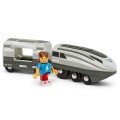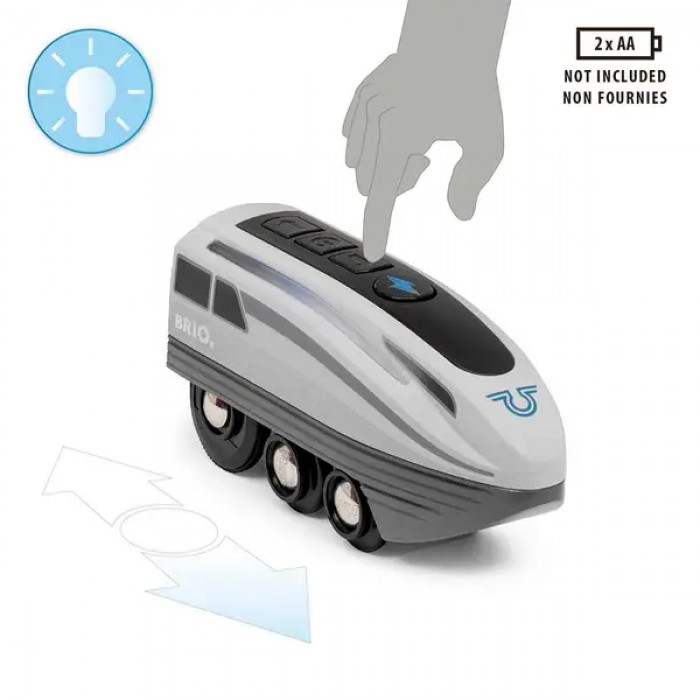 Поїзд може рухатися вперед/назад, а кнопка зверху дозволяє переключитися в турборежим для подвійного прискорення на 5 секунд. Цей футуристичний локомотив також включає пасажирський вагон, в якому достатньо місця для одного щасливого пасажира, щоб насолодитися хвилюючою поїздкою, яку він запам'ятає назавжди. Як і всі локомотиви бренду, його можна примагнітити до інших вагонів. Вирушайте у подорож з новим набором. Тепер можна вигадувати ще більше ігрових сюжетів у місті BRIO.