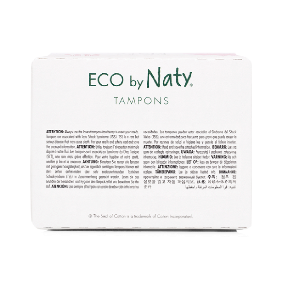 Органічні тампони з аплікатором Eco by Naty зроблені з 100% органічної бавовни, а не просто містять 0,00001% бавовни. Дуже важливо, що бавовна не тільки натуральний, а саме органічний, так як це означає що він вирощений без пестицидів, хімічної обробки і відповідає всім законам органічного землеробства. Не містять в складі хлору, продуктів нафти і нафтопереробки, барвників, синтетичних волокон. Це підтверджується найсуворішим органічним сертифікатом для текстилю GOTS. Також тампони Eco by Naty мають сертифікати Cotton, ICEA, Vincotte, Cruelty Free, Vegan.